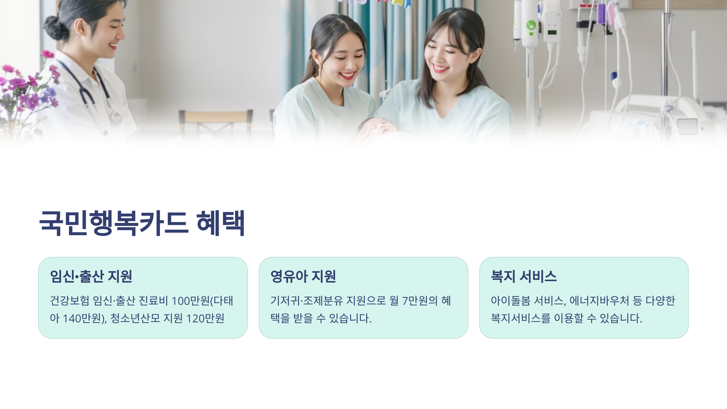 국민행복카드는 다양한 정부 지원 혜택을 하나의 카드로 받을 수 있는 통합 바우처 카드예요. 임신·출산 진료비 지원부터 영유아 보육료, 기저귀·분유 지원까지 여러 복지 혜택을 받을 수 있어요.