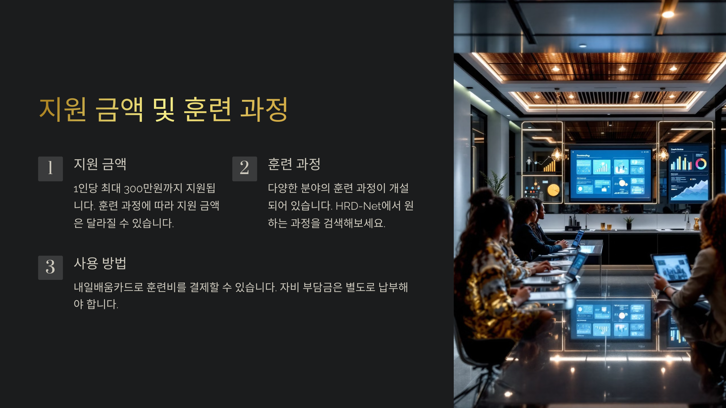 이 카드는 최대 300~500만 원까지 지원되며, 다양한 온라인 및 오프라인 교육 과정을 수강할 수 있어요. 특히 요즘 인기 있는 IT, 디자인, 마케팅, 요리, 뷰티 등의 과정도 포함되어 있어 활용도가 높답니다.