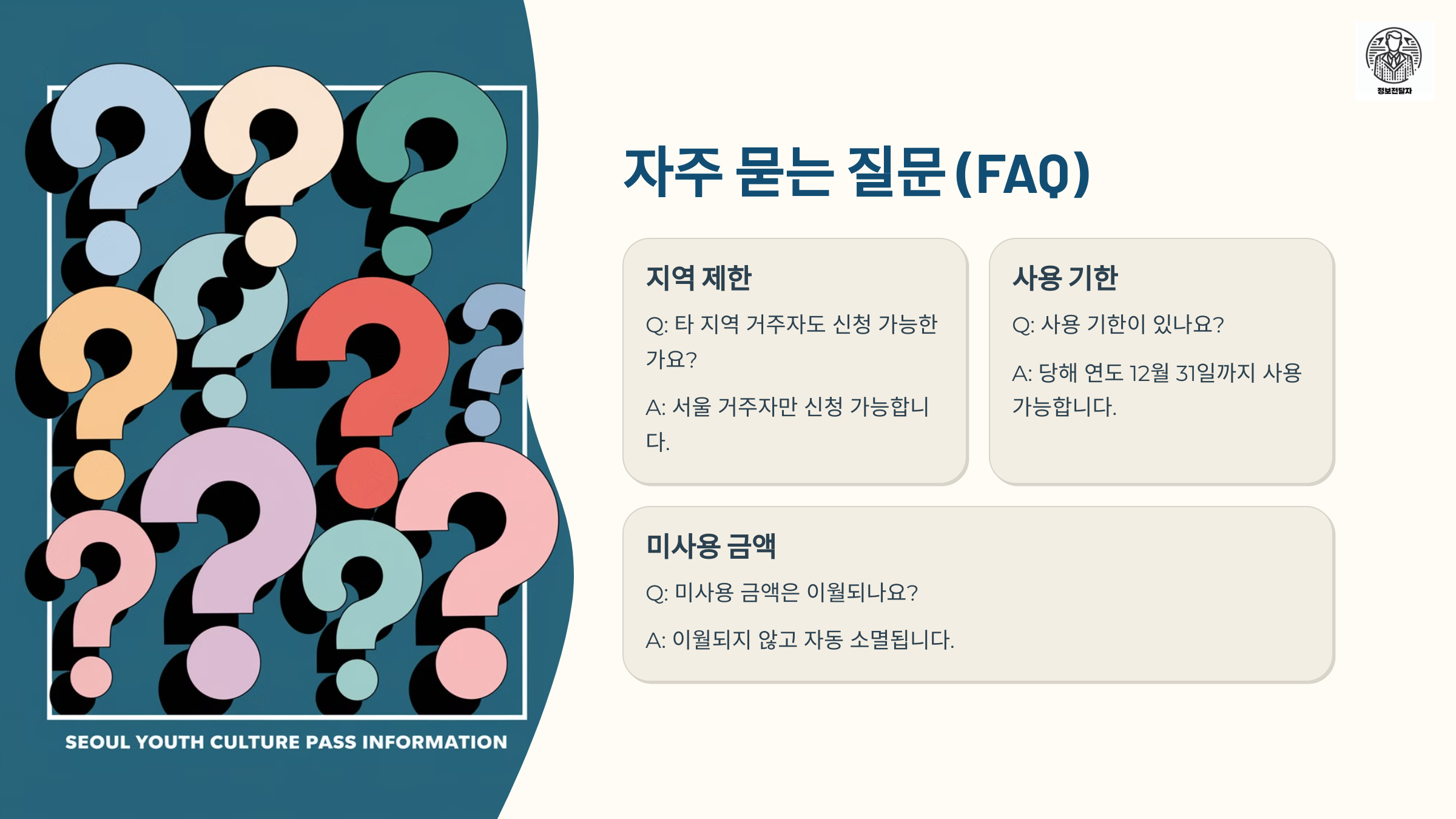 서울청년문화패스를 신청하려다 보면 궁금한 점이 많을 거예요. 그래서 자주 묻는 질문을 정리해 봤어요!