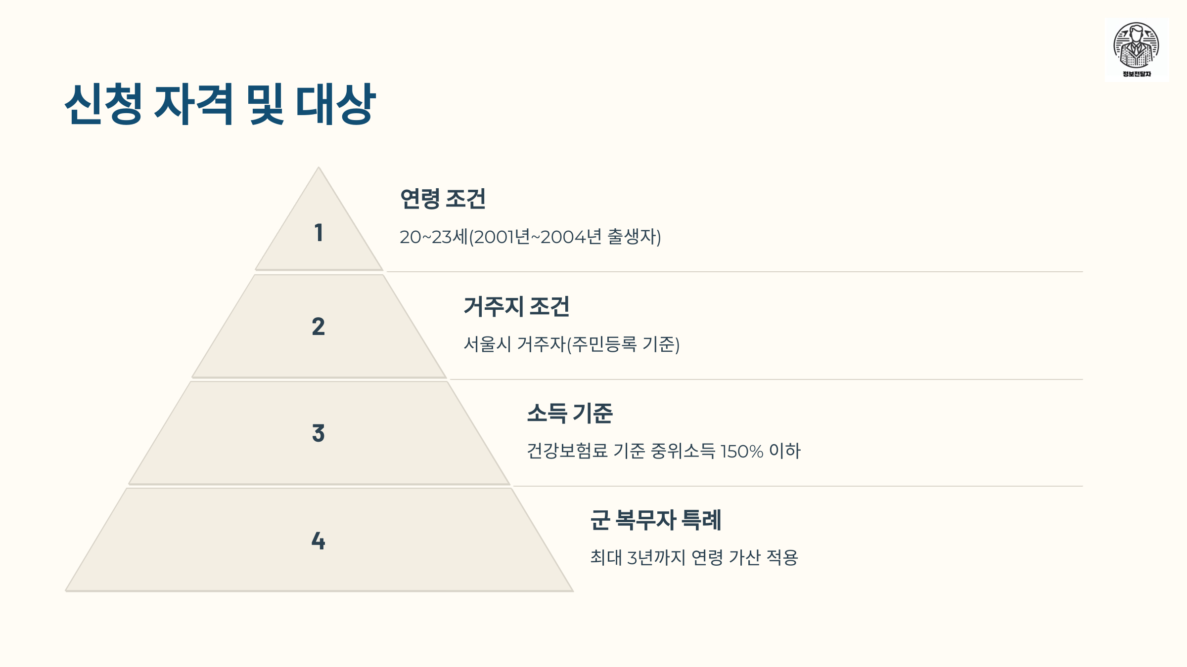먼저, 서울시에 거주하는 19세~34세 청년이라면 기본적으로 신청할 수 있어요. 여기서 중요한 포인트는 ‘주민등록상 주소지가 서울’이어야 한다는 거예요. 단순히 서울에서 직장 생활을 하고 있거나, 학교를 다니고 있는 것만으로는 신청이 어려울 수도 있어요!