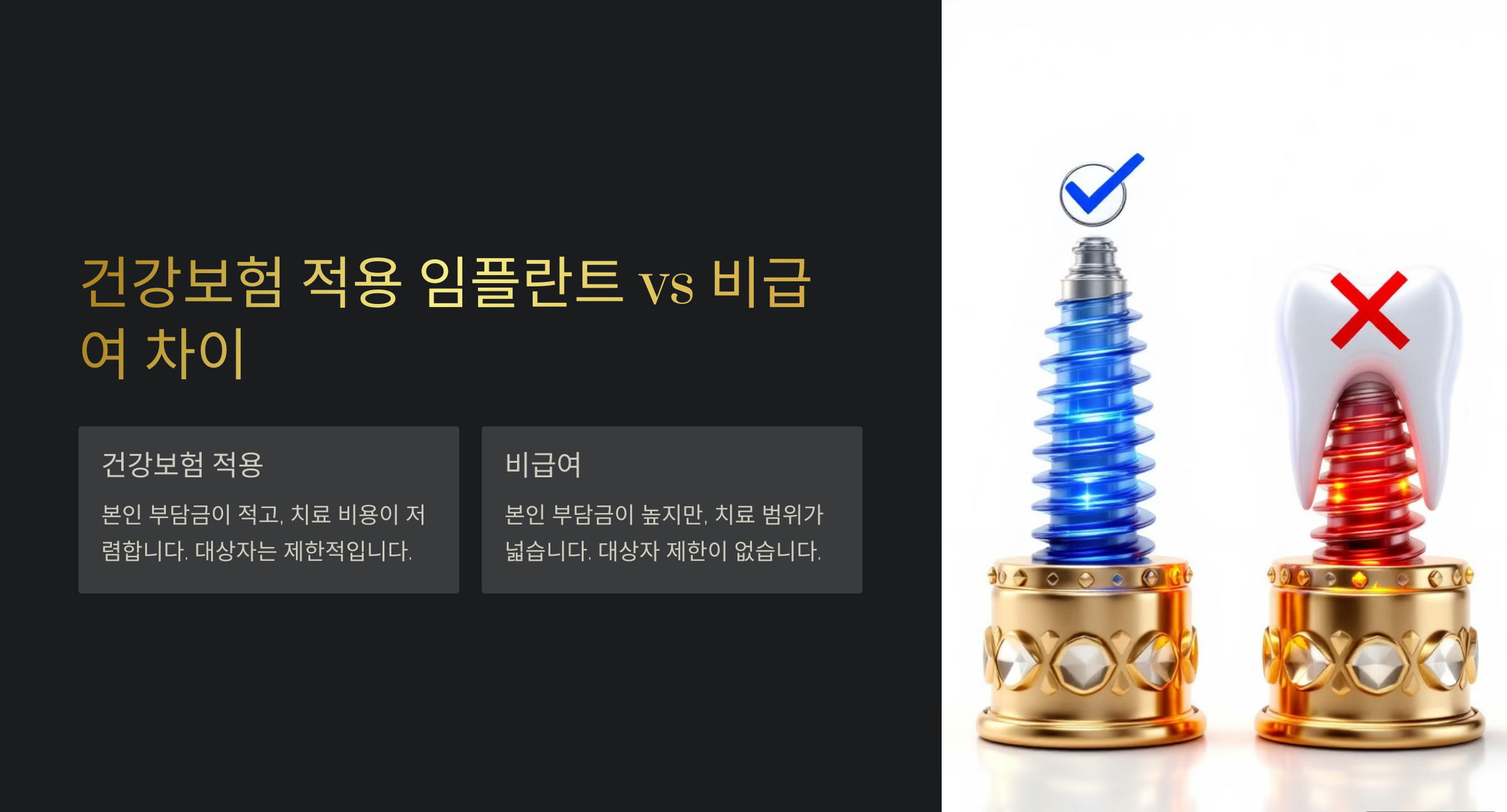 ✅ 건강보험 적용 임플란트 특징 - 가격이 저렴하지만 사용 가능한 재료가 제한적 - 정부 기준에 맞는 치과에서만 시술 가능 - 시술 후 유지 및 보수 관리 필요