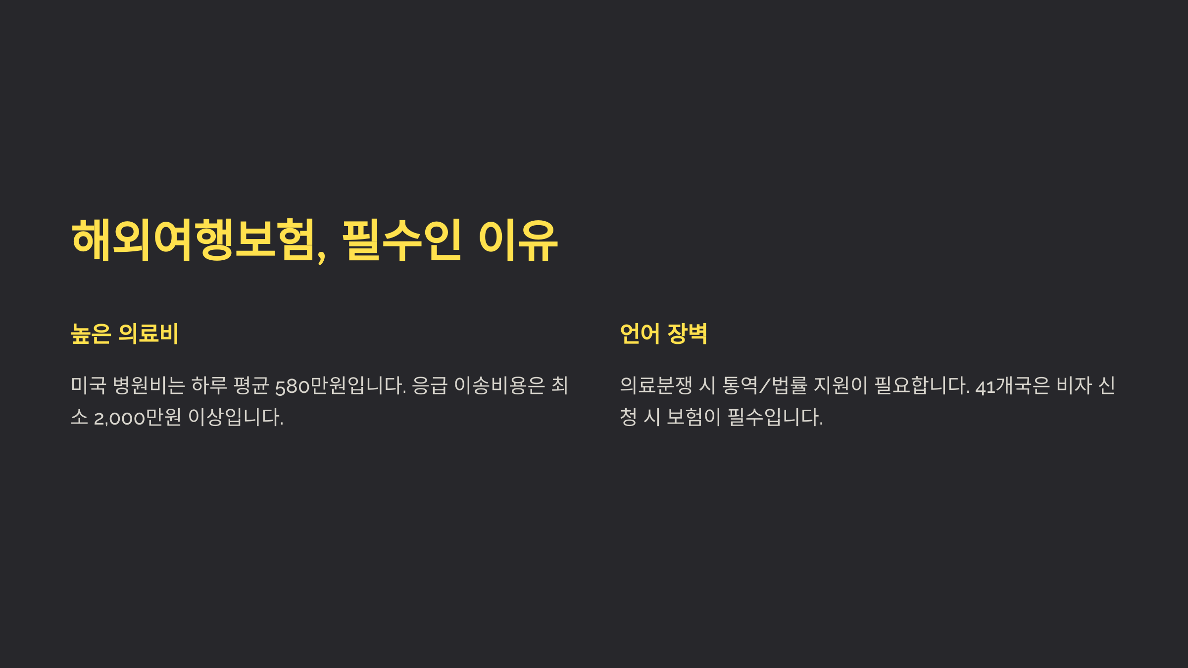 특히 의료비가 비싼 미국이나 유럽에서는 간단한 치료만 받아도 수백만 원이 나올 수 있어요. 심각한 사고가 발생하면 병원비가 억 단위로 청구되기도 해요. 여행을 즐기다가 예기치 못한 상황에 처하면 정말 난감하겠죠?