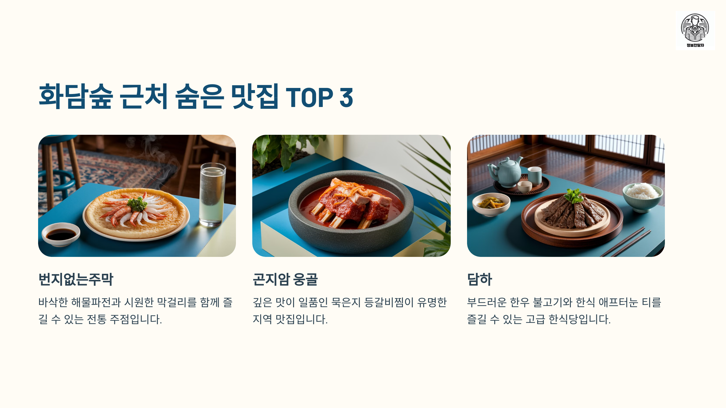 내가 생각했을 때, 화담숲을 둘러본 후 맛있는 음식으로 마무리하면 하루가 완벽해지는 것 같아요. 한정식, 오리구이, 막국수 중에서 취향에 맞는 곳을 골라보세요!