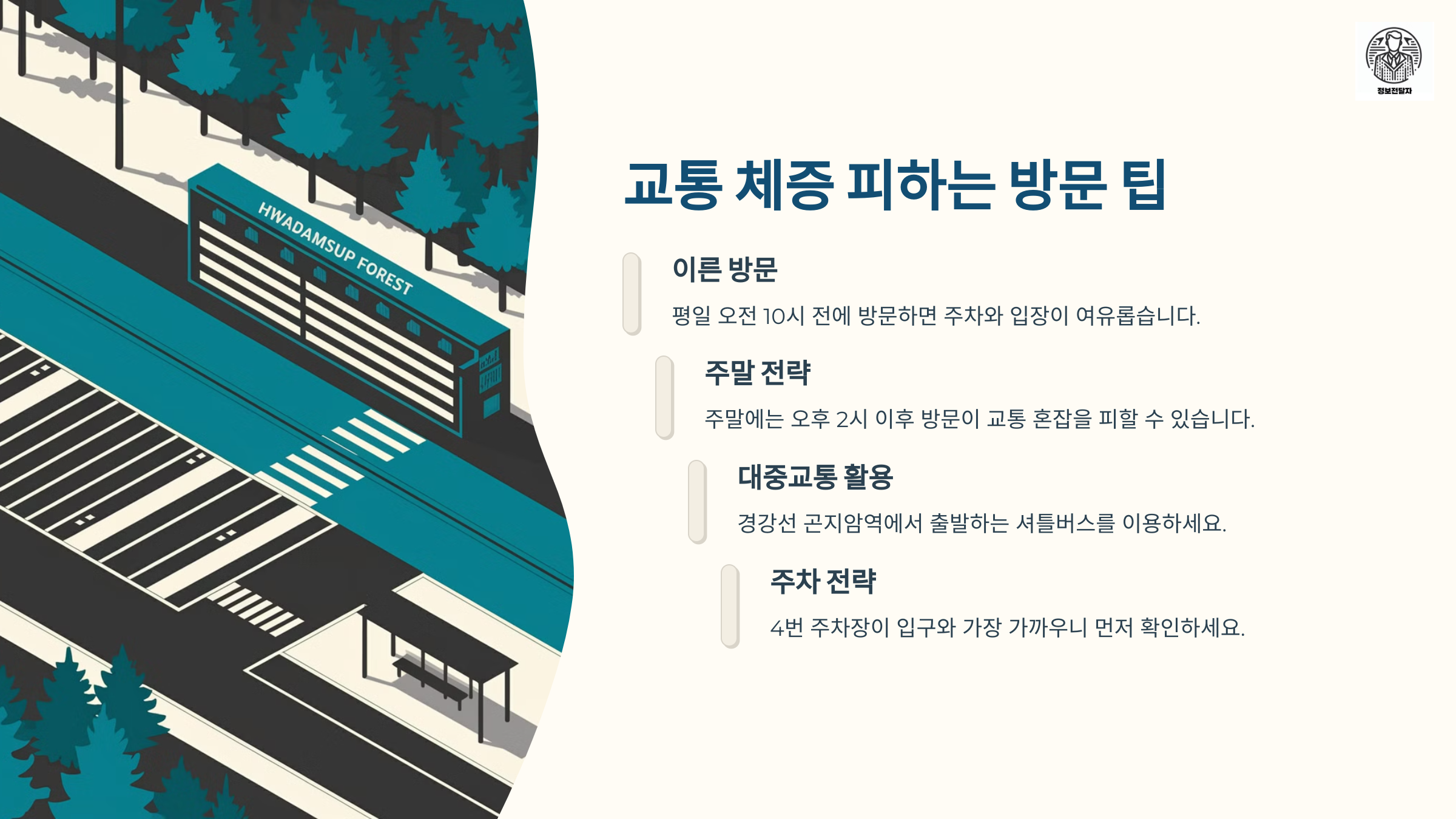 주말에는 방문객이 많아 10시 이후부터는 교통체증이 심해져요. 특히 화담숲 입구에서 주차장까지 가는 길이 혼잡할 수 있어요. 조금 일찍 출발해서 여유 있게 도착하는 게 좋아요!