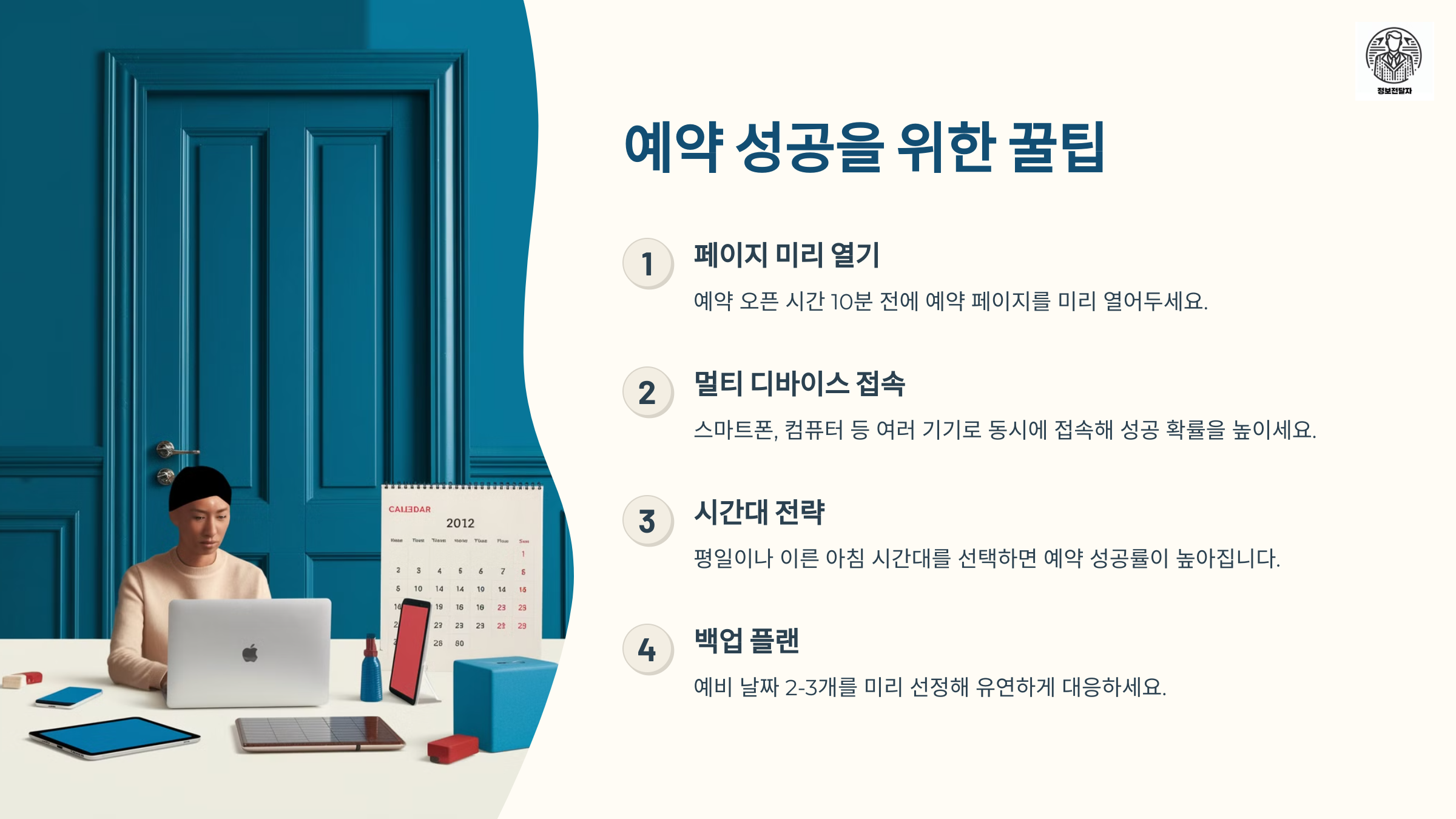 | ⏰ 빠른 시간대 공략 | 오전 10시 이전이 예약 경쟁이 덜함 |