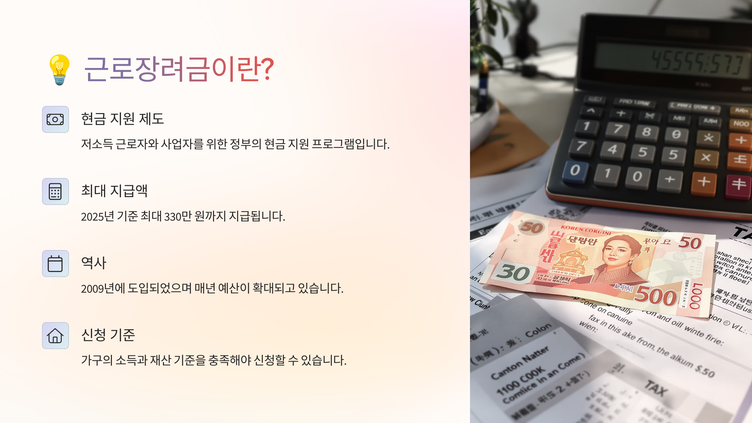 근로장려금은 일은 하지만 소득이 낮아 생활이 어려운 근로자, 자영업자, 종교인에게 정부가 현금으로 지원해주는 대표적인 ‘일하는 복지’ 제도예요.