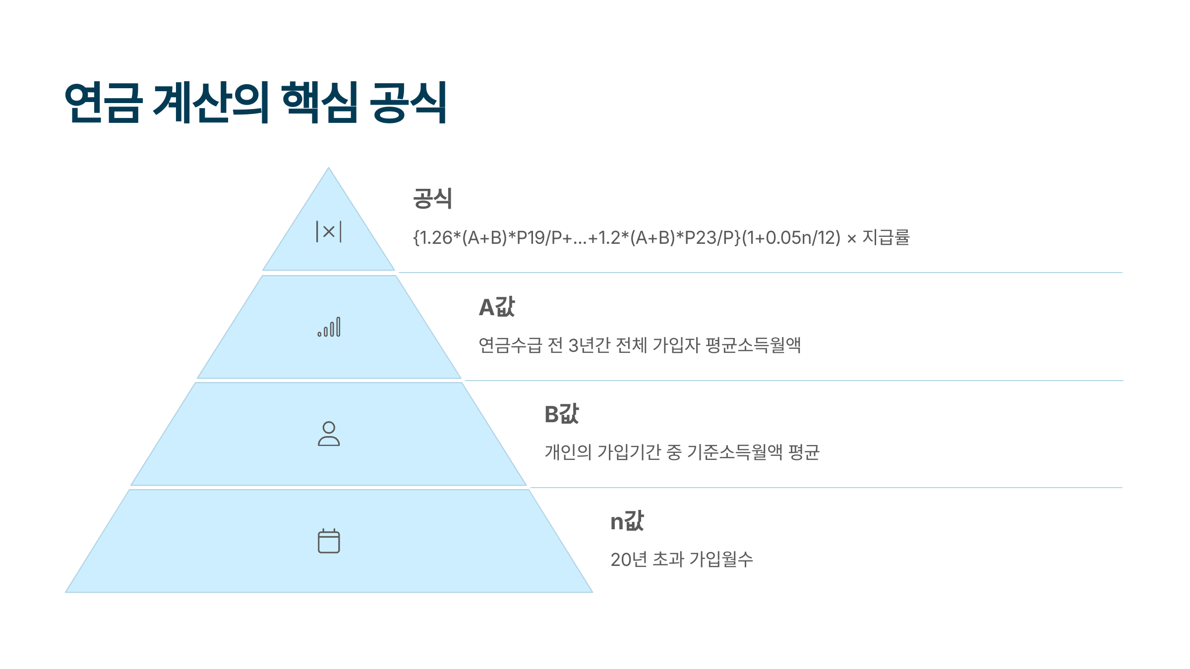 2025년 기준 국민연금 수령액 계산 공식은 이렇게 구성돼요: