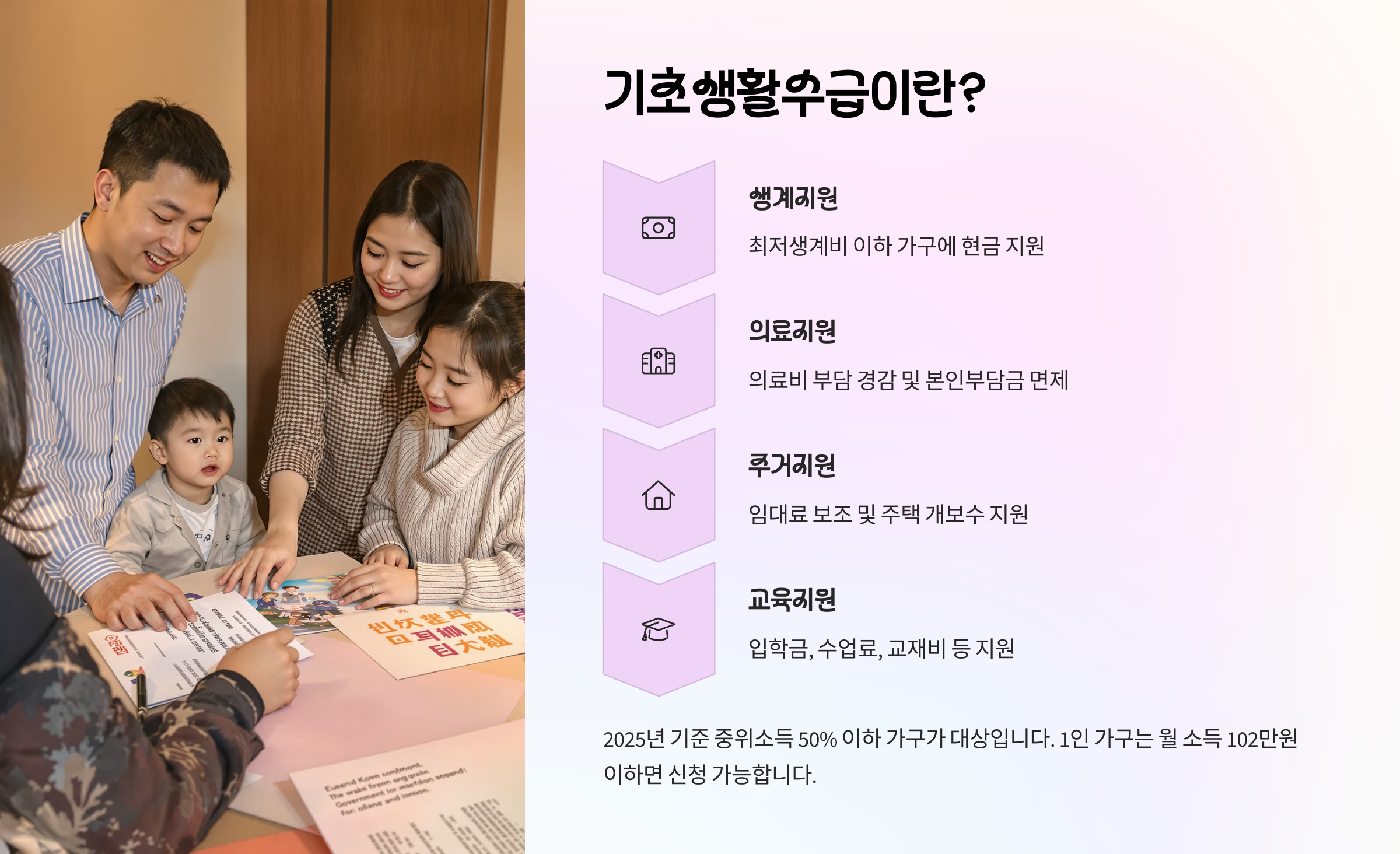 2025년에는 중위소득 인상에 따라 1인 가구 기준 생계급여 수급 가능 소득기준이 약 69만 원까지 올라갔고, 주거급여나 교육급여는 부양의무자 기준이 완전히 폐지되어 더 쉽게 접근할 수 있게 되었어요. 🎉