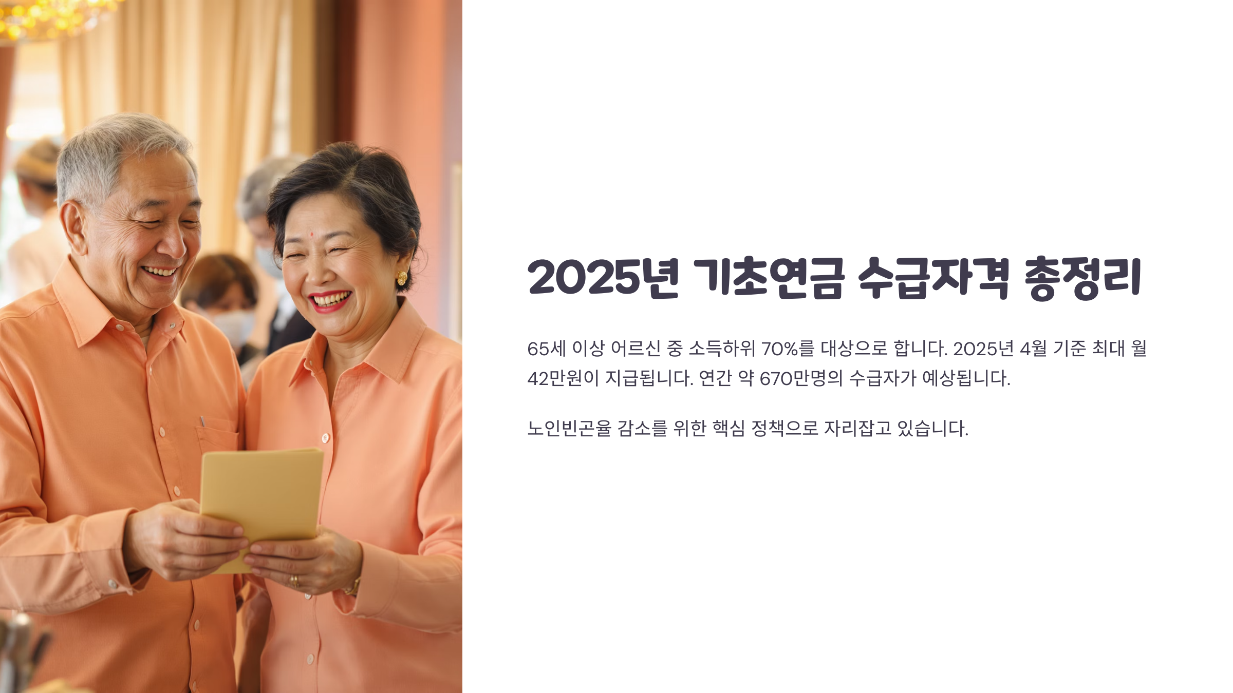 2025년 현재 기초연금 제도는 인구 고령화가 빠르게 진행됨에 따라 점점 더 많은 사람에게 지급될 수 있도록 구조가 바뀌고 있어요. 특히, 단순히 나이만으로 자격을 판단하지 않고 소득과 재산을 함께 고려하는 점이 특징이에요.
