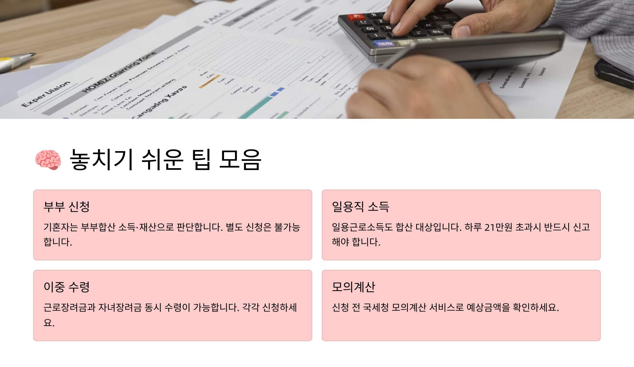 근로장려금을 신청할 때 많은 분들이 실수하거나 놓치는 부분이 꽤 있어요. 단순히 자격만 충족한다고 해서 무조건 받을 수 있는 게 아니기 때문에, 몇 가지 꿀팁을 기억해두면 좋아요!