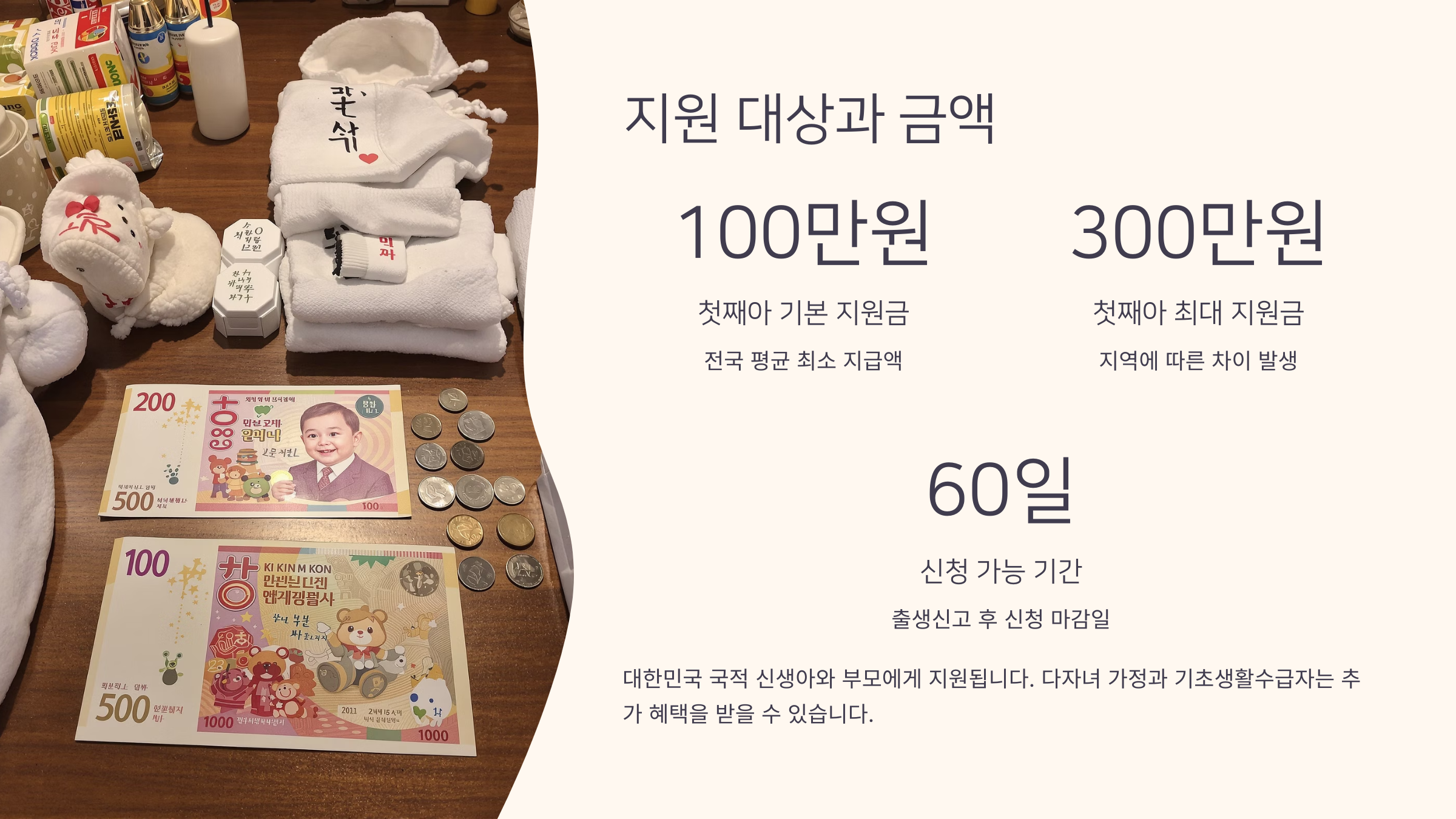 지원금의 목적은 아이 양육 초기에 드는 각종 비용을 덜어주는 데 있어요. 기저귀, 분유, 예방접종, 산후조리 등 다양한 지출에 도움이 되죠.