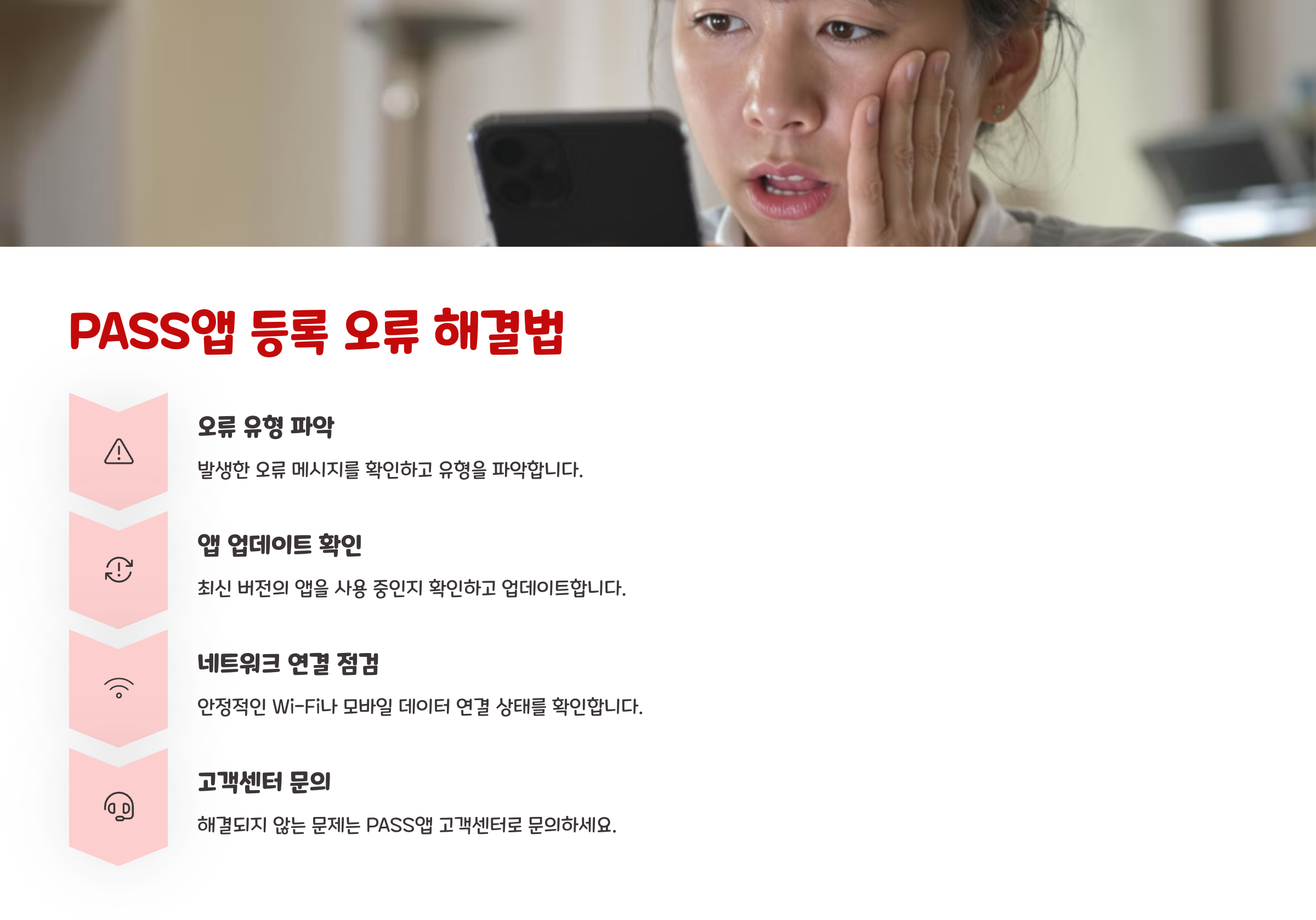 PASS앱을 사용할 때 가끔 오류나 실패 메시지가 뜨는 경우가 있어요. 대부분 간단한 조치로 해결 가능하니 아래 항목 참고해 주세요.